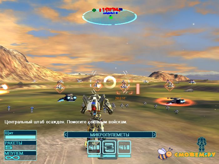 Убойный pure action с отменной графикой, армадами танков, пушек и самолетов, полным рюкзаком навороченного супероружия, динамичным геймплеем и задорной музыкой. В общем все, что должно быть в "мясном" шутере, где единственной задачей является размазывание нападающих со всех сторон по чернозему толстым слоем, здесь имеется. Игровой процесс сводится к аннигиляции всех боевиков, которые высыпали на карту и жаждут вашей крови. В это смысле все, как обычно: они – плохие, мы – хорошие, они – красные, мы – синие. Они нападают на наши города и электростанции, они атакуют, мы защищаемся, смачно поливая их огнем из пистолетов, забрасывая гранатами и бомбами, распыляя самонаводящиеся ракеты и торпеды. Боеголовки то и дело свистят у самого уха, лазеры прочерчивают небо в поисках новых целей, а адские ядовито-желтые "грибы", образующиеся на месте взрывов, то и дело грозят накрыть с головой. Чем ближе к финалу, тем сложнее выполнить задание: враги становятся все изворотливее, а пушки – мощнее.