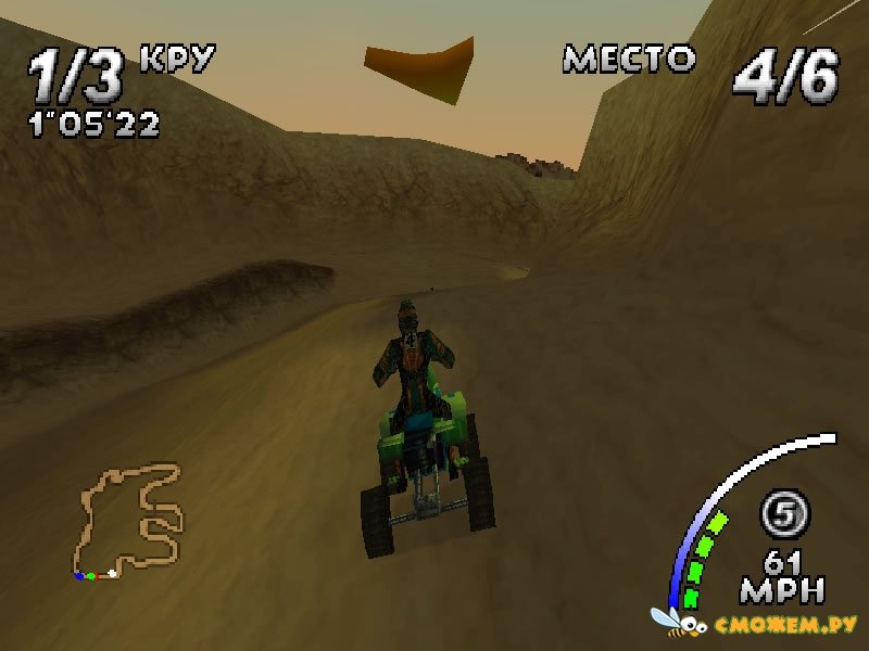 Вы участвуете в гонках на четырехколесных мотоциклах! Рев двигателей, грязь летящая из под колес, безумные прыжки и столкновения!