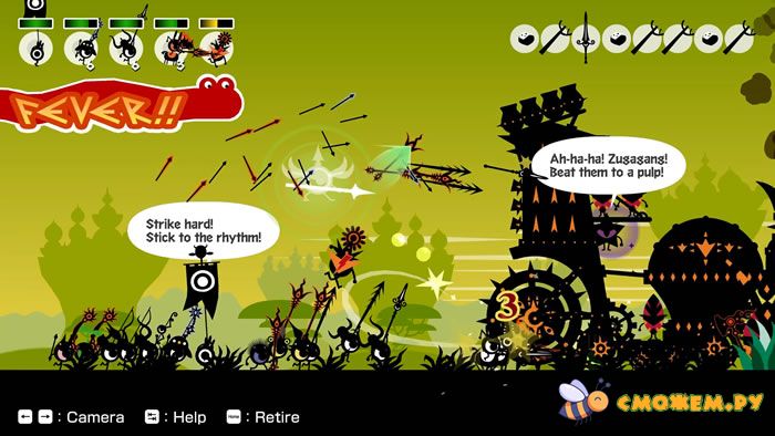 - Простую систему управления: играйте ритмичные мелодии на барабанах Пата(←), Пон(→), Дон(↓), Чака(↑), чтобы командовать патапонами