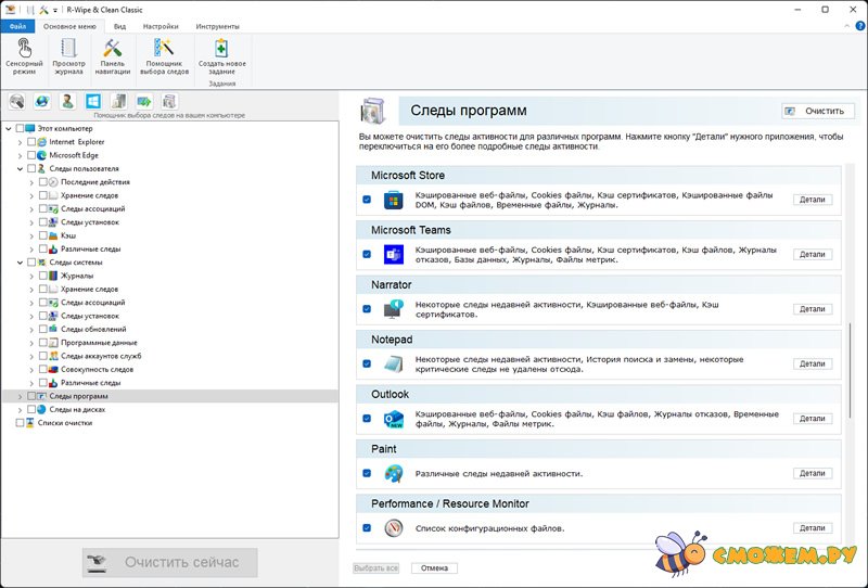 - Удаление системной информации: Очищает данные из системного реестра, журналы событий Windows, журналы брандмауэра Windows, информацию об установленных приложениях, и многое другое.