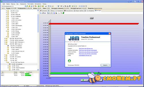TreeSize Professional с ключом - программа для определения занятого места на жестком диске. Показывает дерево находящихся на жестком диске директорий вместе с их размерами, позволяя при необходимости распечатать результат.