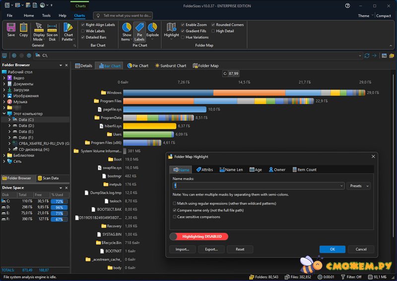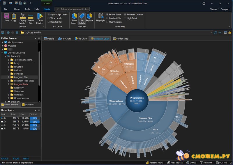 FolderSizes 10 позволит вам провести проверку жестких дисков на наличие на них свободного места. Если вы никак не можете понять, почему места осталось так мало, запустите FolderSizes Pro, и программа создаст для вас полный отчет. Программа сгенерирует диаграммы, которые наглядно покажут, какие папки занимают больше всего места.