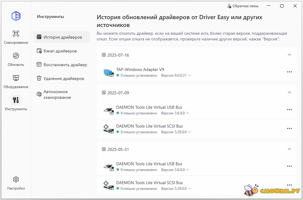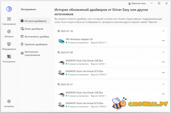Driver Easy Pro поддерживает умное сохранение резервных копий и возможность удаления драйверов или отката к старым версиями. Интерфейс программы полностью на русском языке и очень информативен.