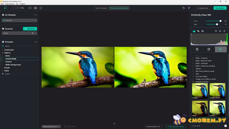 Удивительная программа Perfectly Clear WorkBench которая всего за пару кликов поможет преобразить ваши фотографии до совершенного вида. Умеет работать как в ручном так и в автоматическом режиме, подходит к каждому снимку с использованием интеллектуальной системы сканирования и выявления дефектов. Можно использовать автокоррекцию изображения с засветкой, затемненостью, размытостью, эффектом красных глаз и другими дефектами снимков.