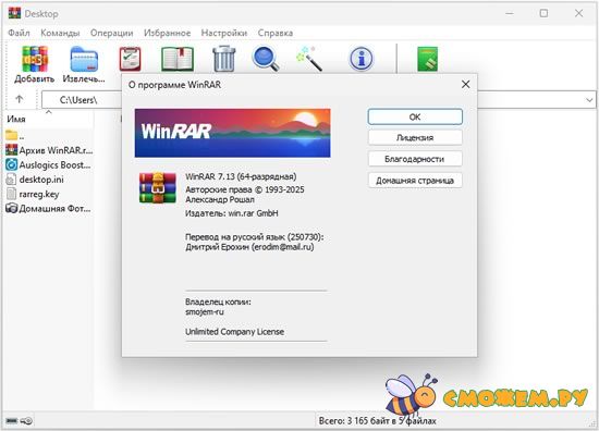 - Готово. Приятной работы от Сможем.Ру 😉 Поддерживаемые ОС: Windows 7 | 8 | 8.1 | 10 | 11 (32-бит / 64-бит) Скачать последнюю версию WinRAR 7.20 с ключом активации на 2025 год Прошлые версии: